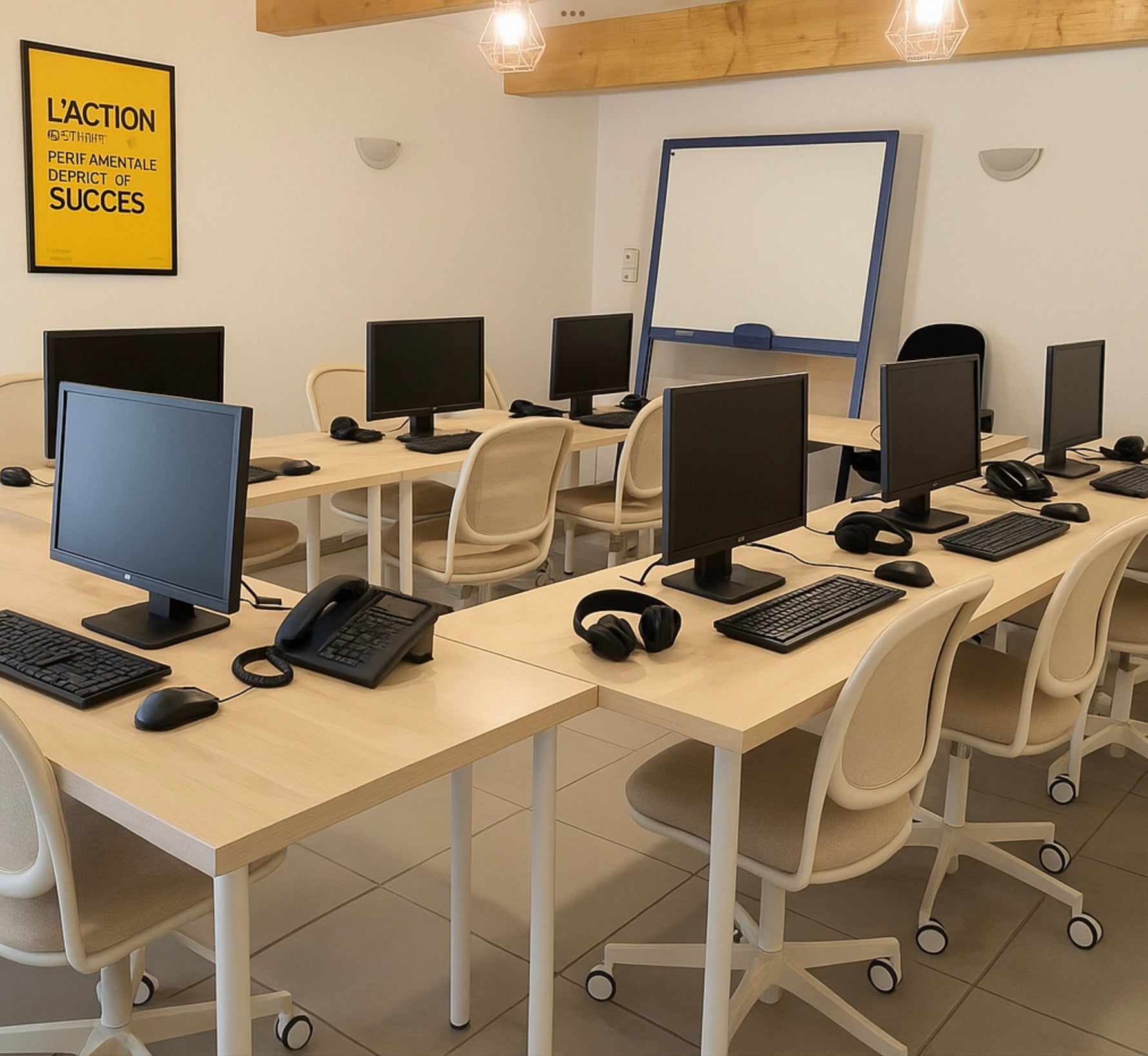 Notre salle de 30 m², idéale pour l’e-learning, accueille 6 à 10 participants dans un espace calme, connecté et fonctionnel, parfait pour des modules à distance ou des suivis individualisés.
