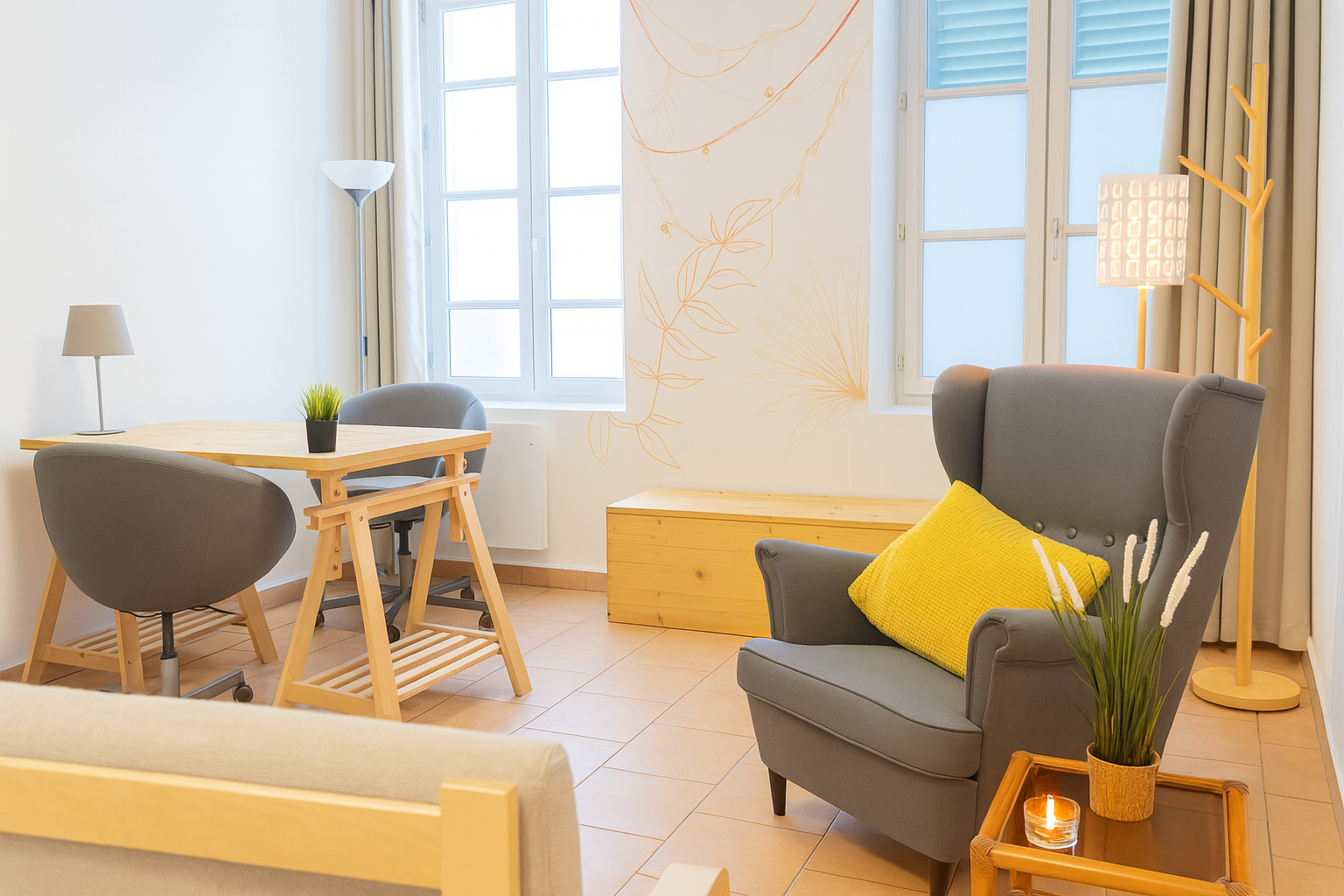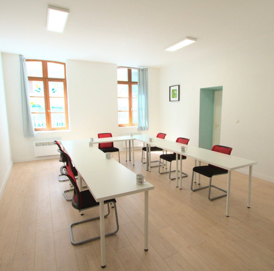 Notre salle de rendez-vous de 12 m² accueille de 2 à 4 personnes, idéale pour les suivis individualisés, entretiens avec les formateurs ou discussions personnalisées.
